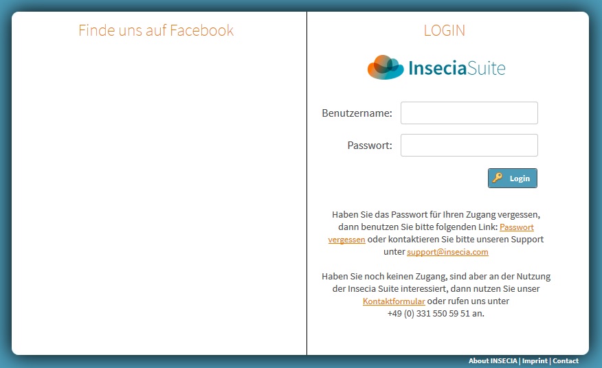 WählenSie sich mit Ihrer individuellen Nutzerkennung und zugehörigem Passwort inIhren Nutzerbereich der Insecia Cloud ein und greifen Sie auf die für Sie freigeschalteten Module der Insecia Suite zu.