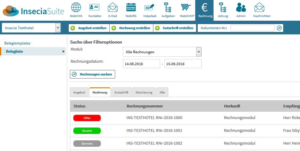 Unter dem Navigationspunkt Belege können Sie direkt Angebote, Rechnungen, Lieferscheine, Stornorechnungen und Gutschriften erstellen .