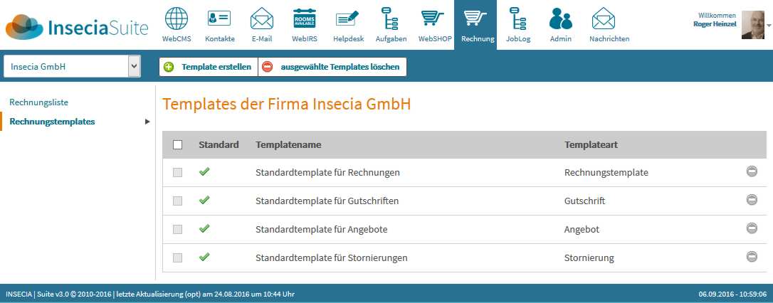 In der Belegverwaltung sind unter Belegtemplates Standard-Templates für Angebot, Rechnung, Gutschrift und Storno hinterlegt.